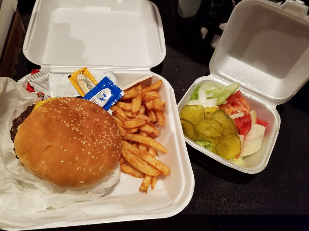 Cheese, Onion, Lettuce, Tomato, with Fries and condiments on the side